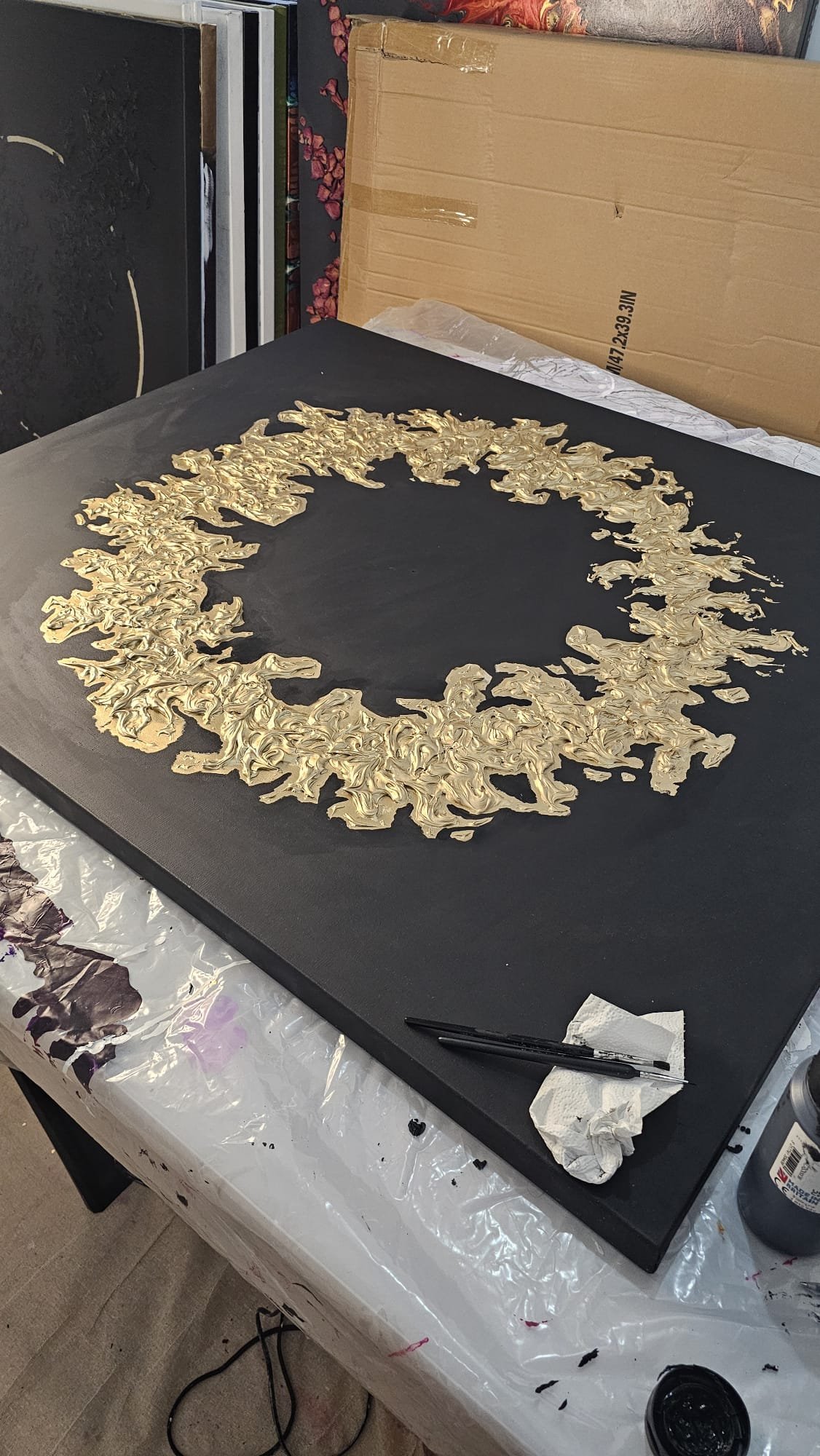 Gavin Johnson’s affinity for circles is eloquently showcased in this captivating abstract piece, highlighting the inherent power and symbolic depth of the circle as a representation of love— omnipresent, multidimensional, and boundless in potential. Within the circle, dynamic elements embody his theme of controlled chaos, illustrating the necessity of tumultuous moments for growth and evolution. The embellished gold texture adorns the artwork with a seductive allure, its luxurious brilliance inviting viewers to draw nearer and be entranced by its opulence. The abundance signified by gold harmoniously resonates with the limitless nature of the circle, resulting in a truly mesmerizing and inspirational composition.
